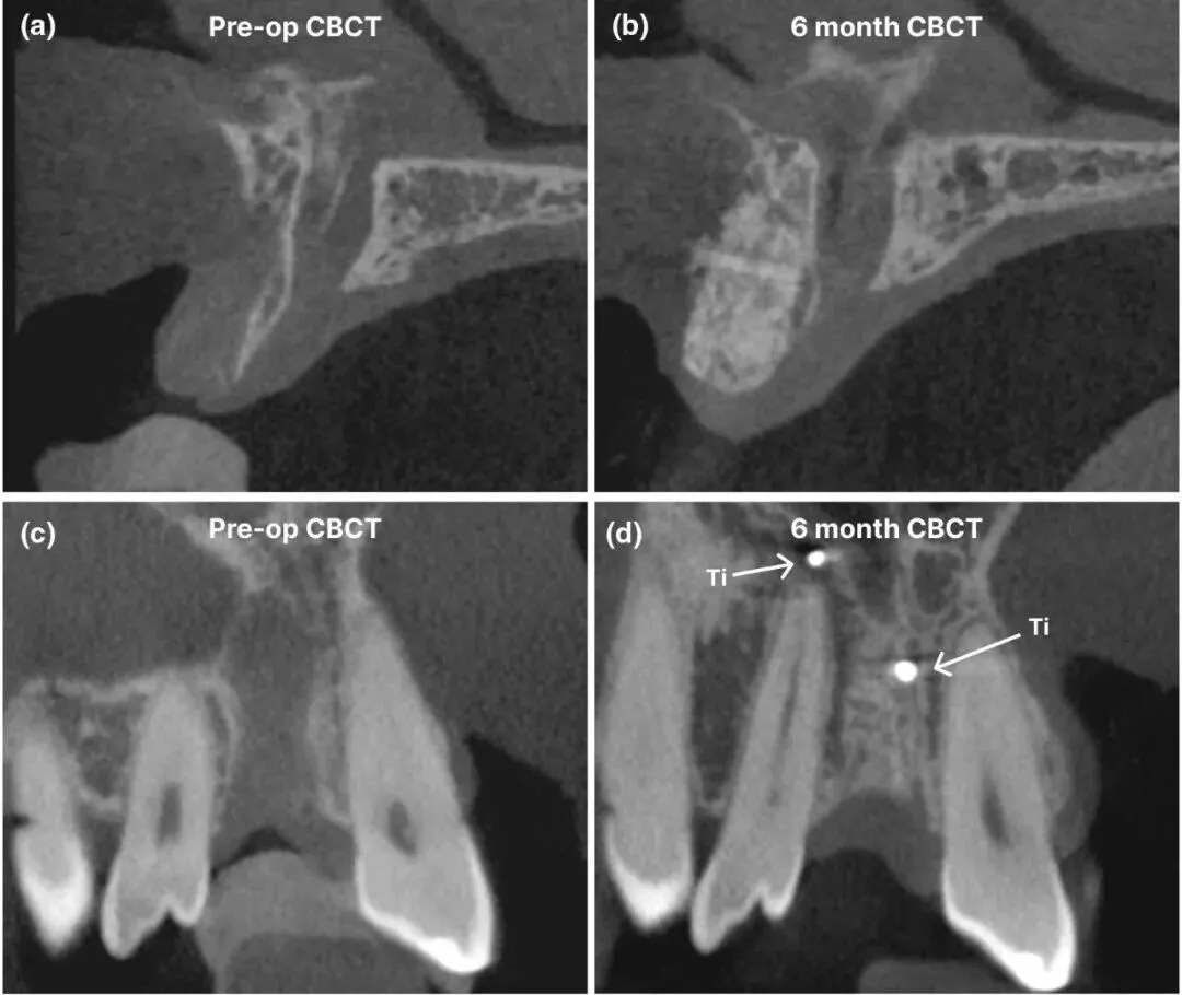 一期(骨增量):翻开牙龈瓣,填入“自体骨屑+小颗粒脱蛋白牛骨矿物质(ABBM,粒径 0.25-1mm)+可注射富血小板纤维蛋白(iPRF)”混合物,植入3D打印 PCL 支架并以钛螺钉固定,缝合后抗感染治疗。