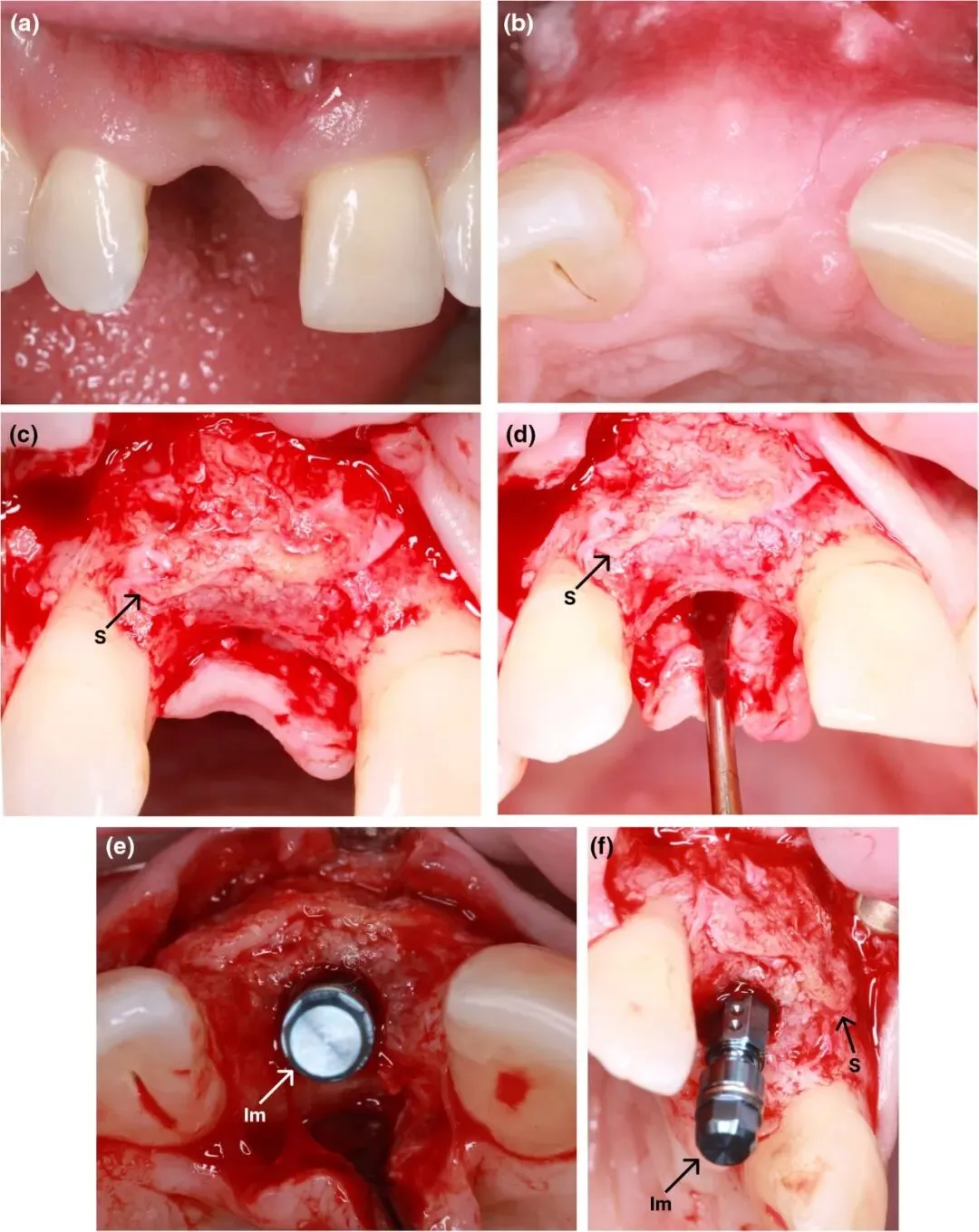 图5 引导骨再生术前与愈合6个月后的影像学对比[(a)和(c)术前矢状面和冠状面横截面;(b)和(d)术后6个月矢状面和冠状面横截面]图6 种植二期手术[(a)和(b)二期手术前口内情况;(c)和(d)为植入物放置准备的翻开皮瓣。(e)和(f)在再生部位植入钛种植体。S=聚己内酯支架,Im=种植体]