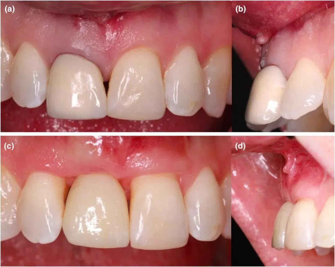 图8 修复前后口内情况对比 [(a)和(b)为修复前,(c)和(d)为修复后]3.患者体验:术后48小时内轻度疼痛(VAS<44mm),第3天起无痛(VAS<5mm);前3天日常活动中度干扰,之后快速恢复,无感染、支架移位等并发症。