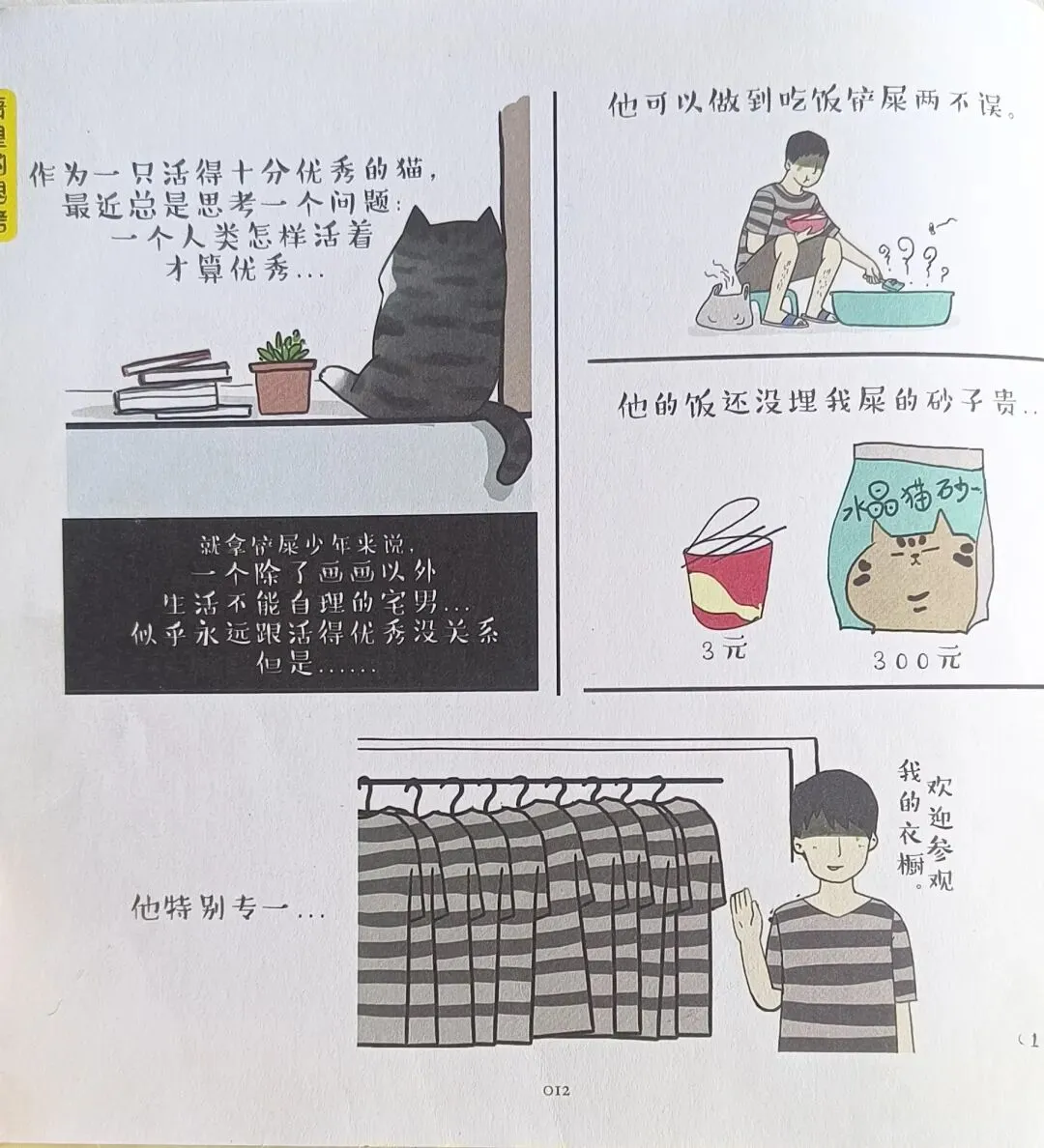 接下来用四页的篇幅来描述猫眼中的少年的样子。画少年一边端着碗一边给猫铲屎,旁白“他可以做到吃饭铲屎两不误”,画少年的衣橱里全部是十几件一模一样的T恤衫。画猫坐在少年的头上,旁白“他脾气特别好”,画少年的饭和猫砂做比较,旁白“他的饭还没埋我屎的砂子贵”,画少年每天在画吾皇,非常认真,旁白“就算是画一条广告也丝毫不懈怠”。