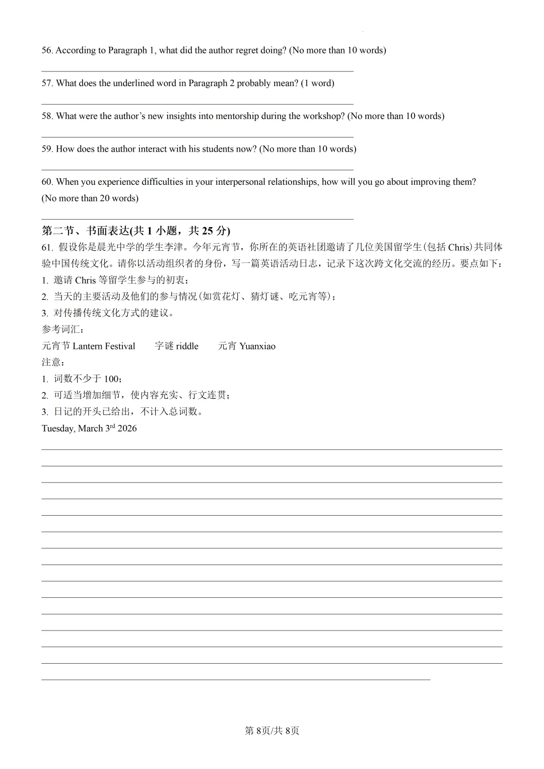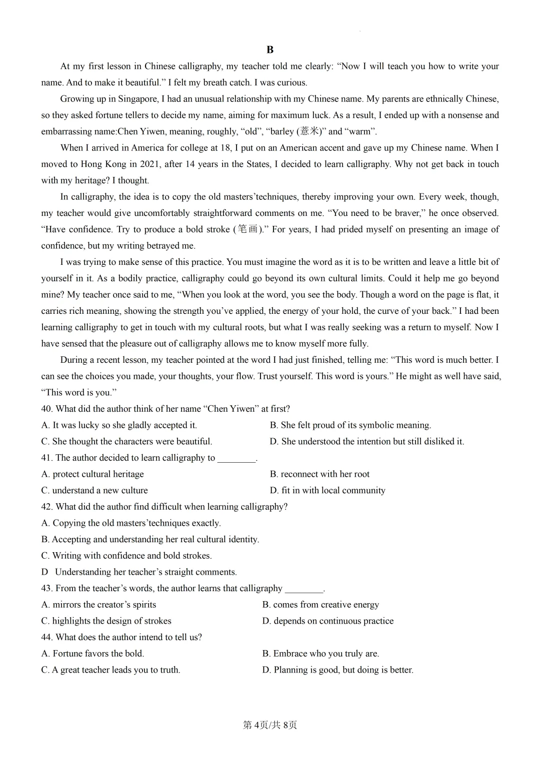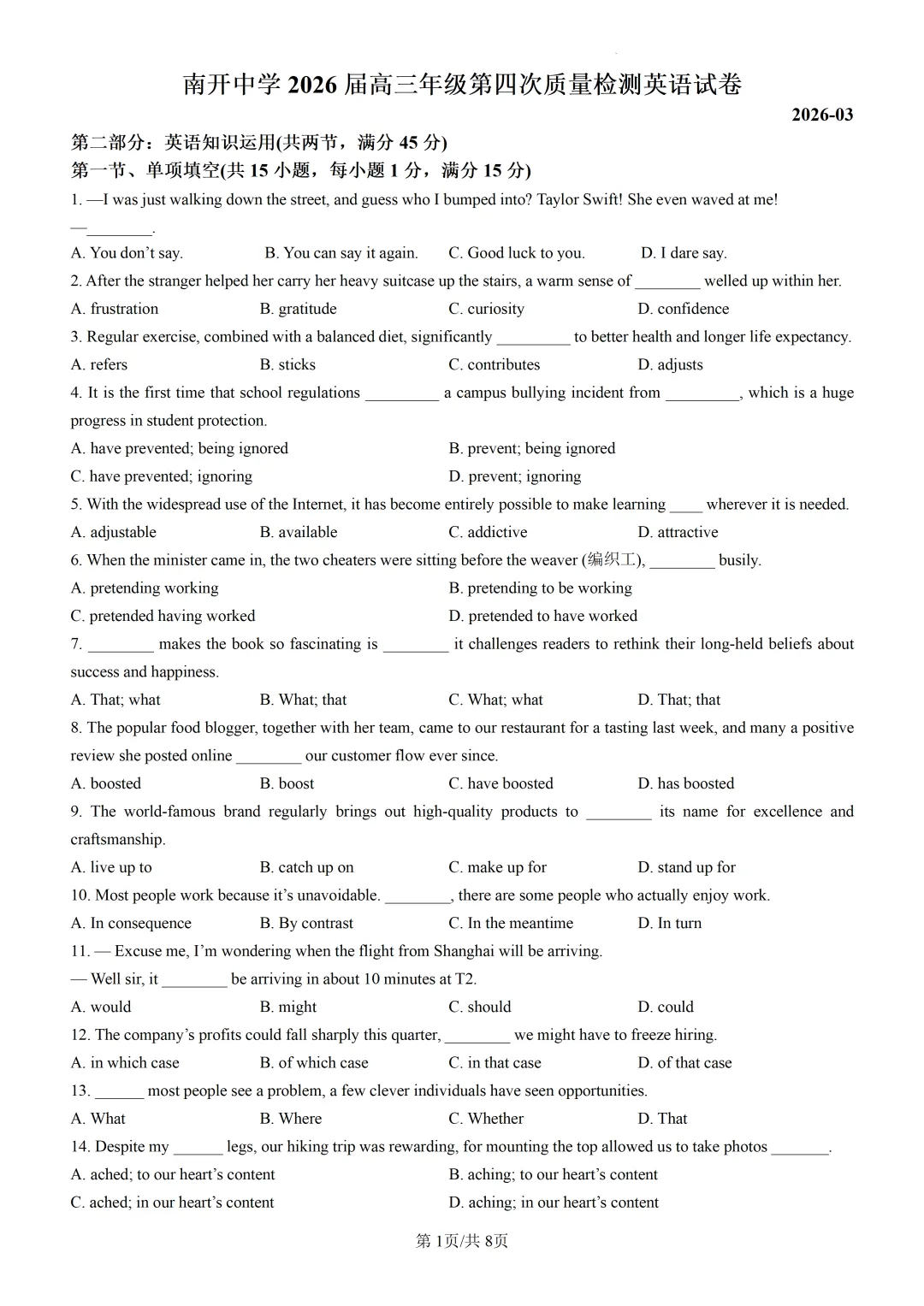 【可打印】天津市南开中学2026届高三年级第四次质量检测英语试卷(附解析) 点击上方“蓝字”免费关注! 本套试卷+答案解析下载入口 关注“卿卿侃古今”公众号 点击左下角阅读原文可下载 相关链接: 2007-2025年天津市高考英语真题汇总(持续更新中~) 2011-2023年天津高考英语听力真题在线测试 【高考英语听力在线测试】高考听力机考模拟试题大全(持续更新中) 【可下载】2025-2026年高中英语试题汇总(附解析)【持续更新中】 【汇总】高中英语月考和期中期末试题(持续更新中~) 【题库】高一英语试题汇编(持续更新中~) 【题库】高二英语试题汇编(持续更新中~) 【题库】高三英语试题汇编(持续更新中~) 【可下载】高三英语上学期期末试题16套(附解析) 【可下载】高二英语上学期期末试题10套(附解析) 【可下载】高一英语上学期期末试题汇9套(附解析) 【可下载】2025-2026学年度高一高二高三开学考试模拟试卷(天津专用)(附解析) 新外研版高中英语高清电子课本、课文原文和译文、单元同步复习资料和试题【持续更新中】 【目录1】高中英语阅读理解限时训练大全(持续更新中~) 【目录2】高中英语完形填空限时训练大全(持续更新中~) 【目录3】高中英语书面表达大全(持续更新中~) 【目录4】高中英语听力训练大全(持续更新中~) 【目录5】高中英语单选题大全(持续更新中~) 【目录6】高中英语语法题大全(持续更新中~) 【目录7】高中英语阅读表达题大全(持续更新中~) 【目录8】科普知识汇总 【目录9】中高考学法知识汇总 【目录10】高考英语真题+名校模拟真题+月考和期中期末试题(持续更新中~) 【目录11】暑期高考英语备考资料大全持续更新中~【汇总】中高考志愿填报资料大全 【汇总】高中英语月考和期中期末试题(持续更新中~) 【汇总】2025届高三英语一模试题(附解析) 【汇总】2024届高三英语一模二模三模试题(附解析) 【汇总】2024届高考英语押题卷(附解析) 【汇总】2025届高三英语周考综合练(附解析) 【题库】高三英语限时训练(持续更新中~) 【模拟】2025届高三英语听力机考模拟试题在线测试 【高考词汇】(新)外研版高中英语全七册词汇表(附音频) 【中考词汇】初中英语外研版必备单词表(完整版),可打印 建议收藏保存 点击阅读原文查更多