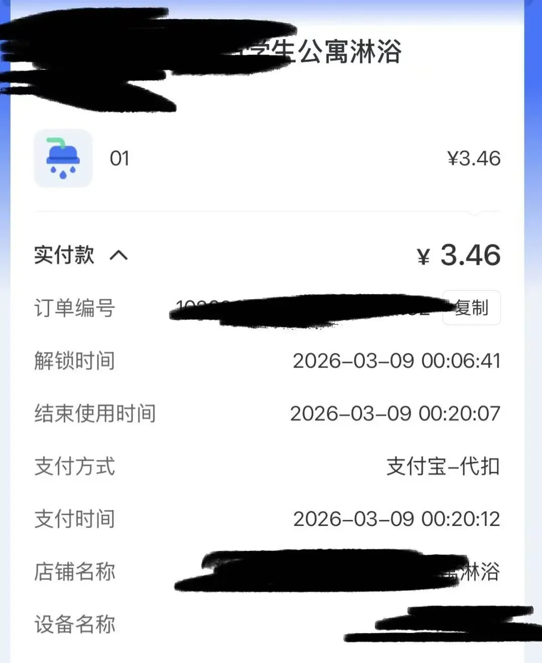 这是我在换宿舍之后的淋浴费用,14分钟,扣款3.46。与在其他校区不需要扫码插卡可用的扣费标准皆然不同,在换宿舍之前,我基本上一学期充一次水费。