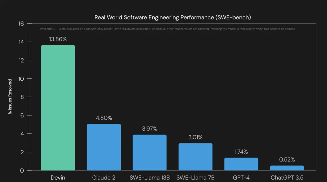 仅从评测结果看,Devin 解决真实世界软件问题的能力要远好于当前的 GPT-4 和 Claude 等模型。