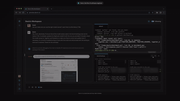 Devin 拥有积极的协作的能力,它能实时报告进度,接受反馈,并根据需要调整,还能适应成熟的代码库,修改前辈留下的 bug: