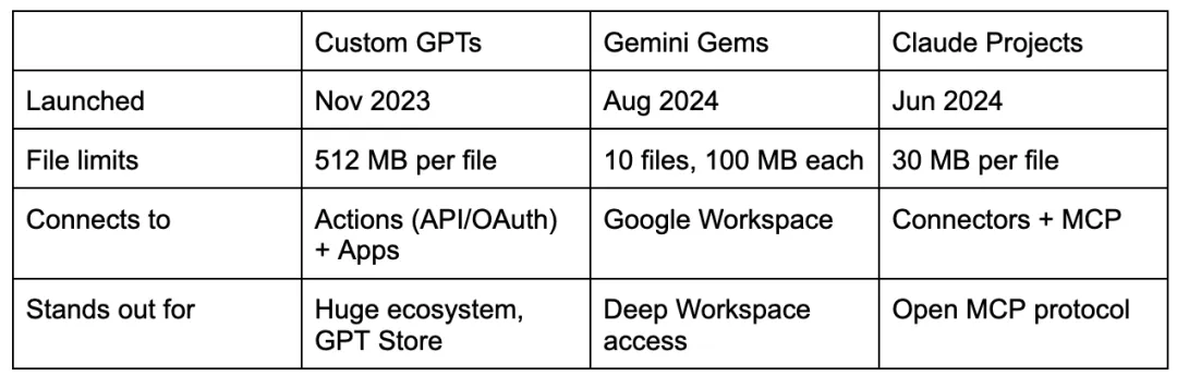 我们将聚焦三大主流平台:Custom GPTs、Gems和Claude Projects,它们的工作原理相似。这些平台均属于定制化AI助手或聊天机器人,用户可向其提供指令、上传参考文件、连接外部工具并实现协作共享。