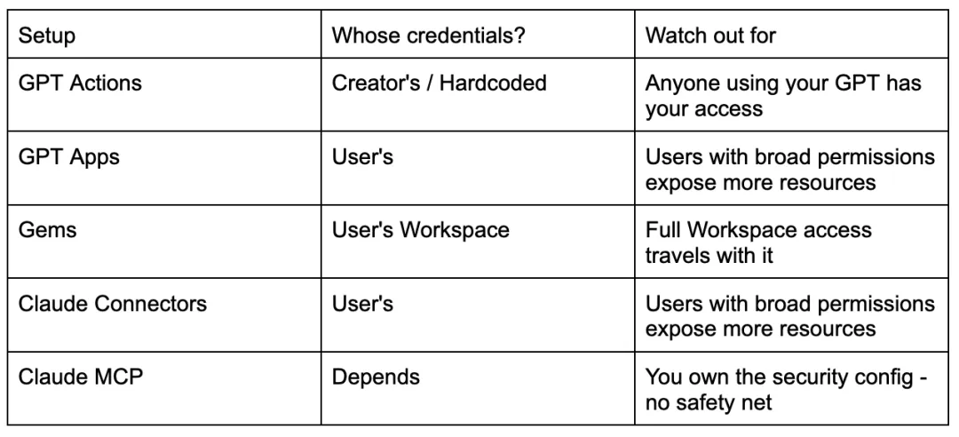2. MCP是Anthropic开发的开放协议,用于连接AI与各类工具。您可自行托管MCP服务器以获得更多控制权,但这本质上是DIY模式。身份验证并非强制要求。虽然可通过用户级OAuth实现规范配置,但早期许多MCP服务器仅要求用户粘贴API密钥,导致密钥被全员共享。听起来很熟悉?这与GPT Actions存在相同问题。