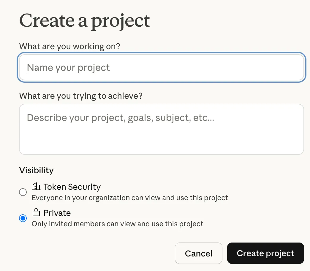 Claude项目可见性选项 – 注意“公开”仅限组织内部可见(不同于GPTs的互联网公开)