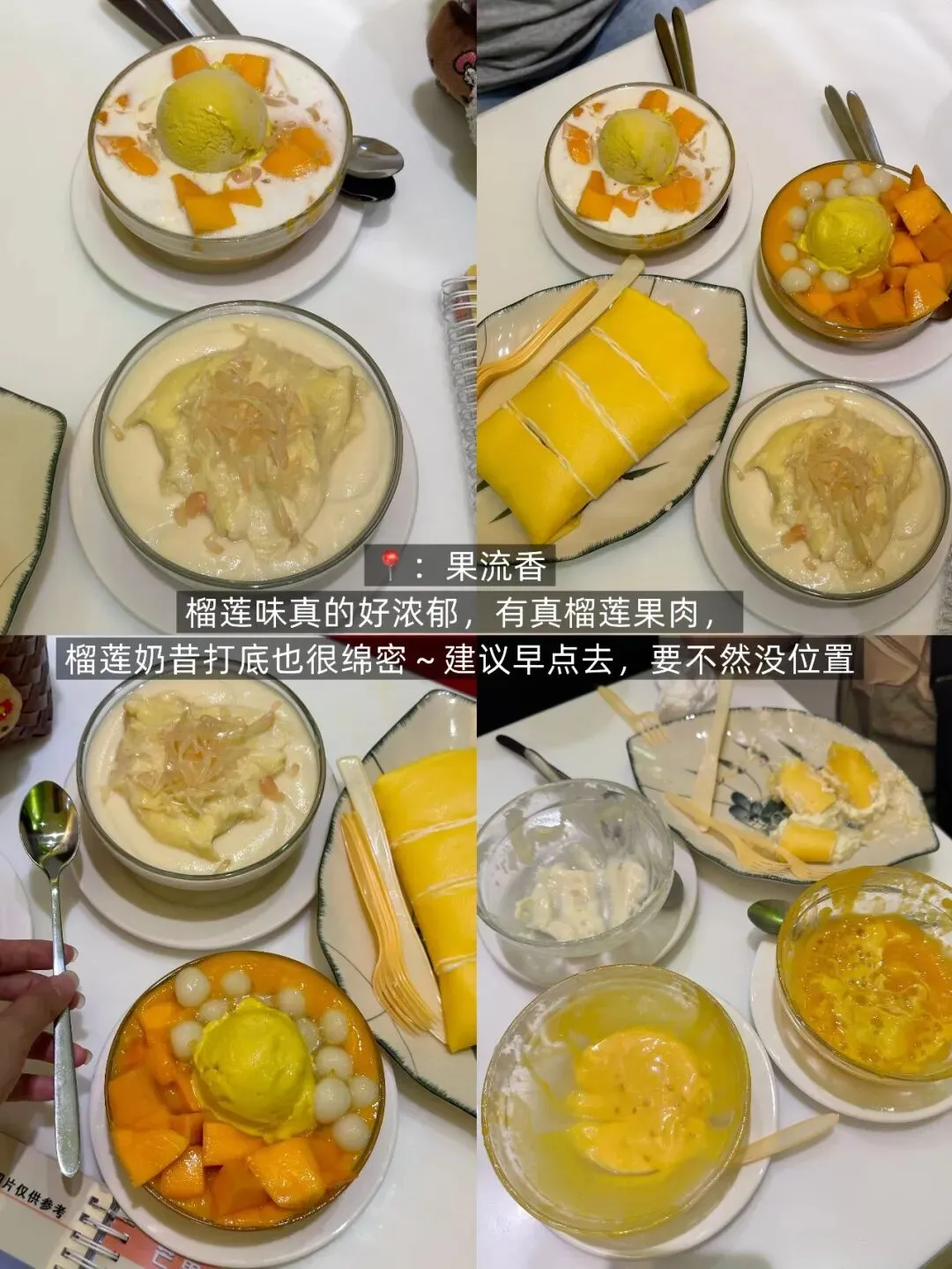 :超大块芒果肉堆得满满当当,手工桂花小丸子弹牙有嚼劲,淋上清甜椰汁,每一勺都是果肉 + 丸子的双重满足; - 3.榴莲炖奶