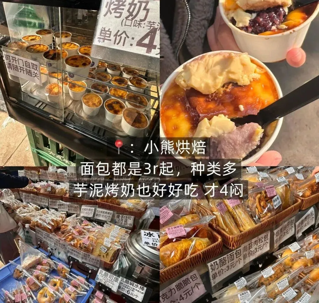藏在广西大学新东园门口(光头明猪脚饭旁)的小熊烘焙,不是豪华大店,而是学生党和打工人闭眼冲的平价现烤面包小摊!每天 11:00 开摊到 23:00(暑假歇业,开学准时回归),刚走近就被暖乎乎的麦香裹住,明档的竹篮里摆满了刚出炉的面包,价格牌写得清清楚楚,均价 3 元左右,性价比直接拉满。