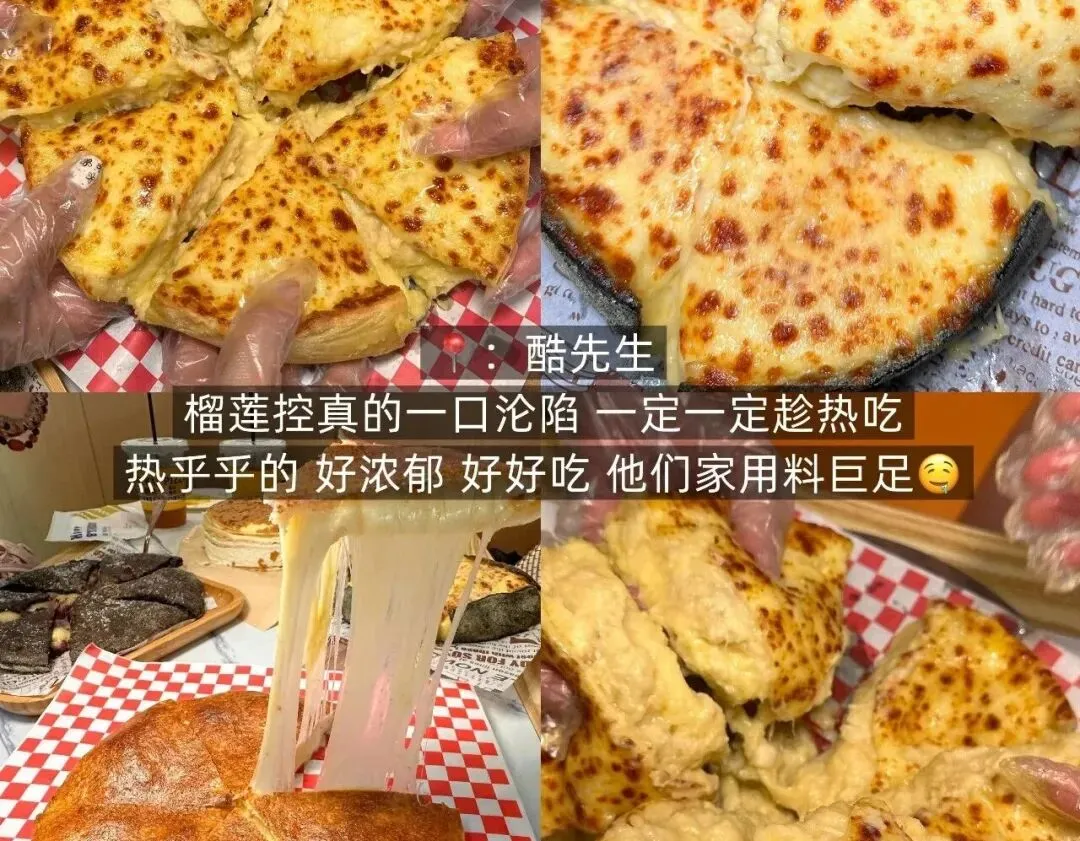 刚出炉的披萨端上桌,金黄的芝士还在咕嘟冒泡,用叉子轻轻一挑,就是超夸张的拉丝!入口先是芝士的咸香醇厚,紧接着是榴莲果肉的绵甜软糯,果香浓郁不腻喉,温热的内馅甚至会在嘴里微微爆浆,甜香瞬间铺满口腔,吃完连手指上的芝士香都忍不住嗦干净。