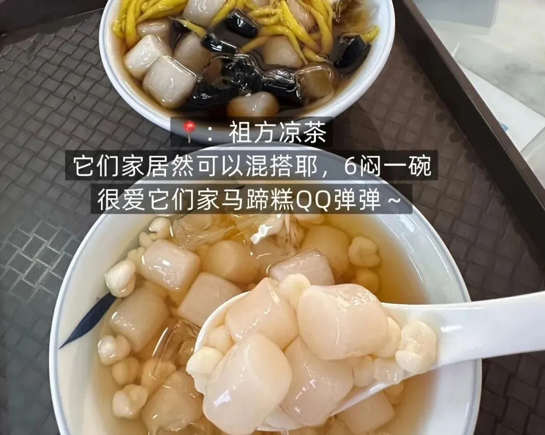 :老广同款的猛火凉茶,入口微苦但回甘很快,熬夜上火、喉咙干涩时来一杯,降火效果立竿见影; - 4.方块凉粉 / 绿豆沙