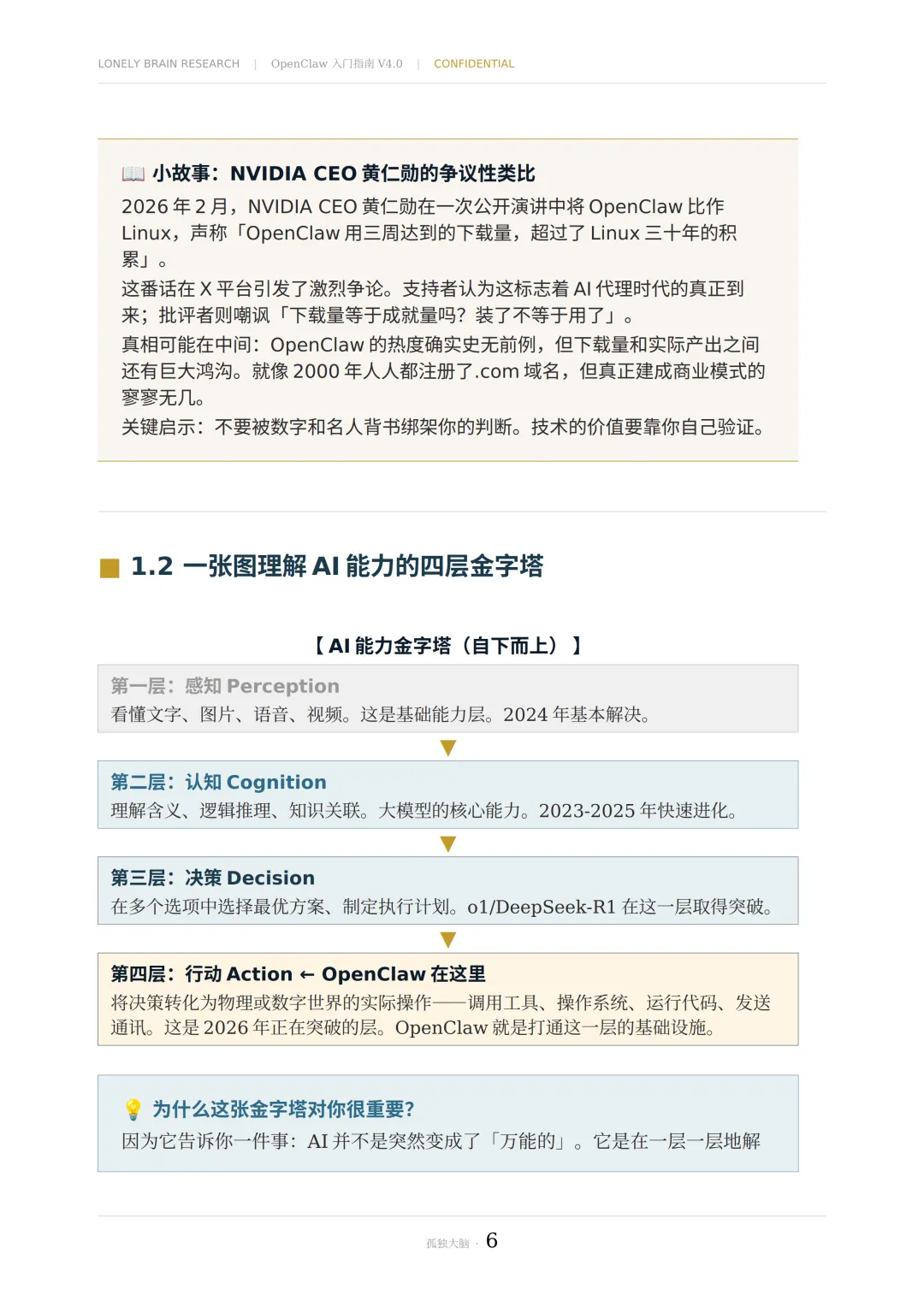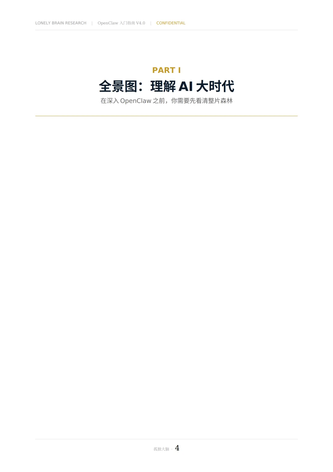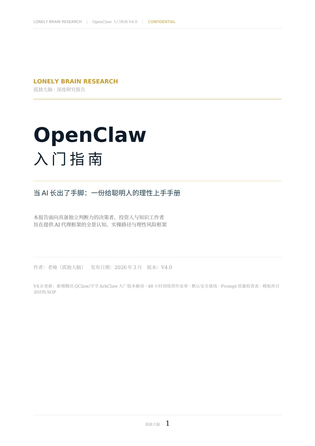 《OpenClaw入门指南:当AI长出了手脚》。这不是一份技术文档。它是写给像你这样有判断力、有好奇心,但没碰过AI代理框架的聪明人的。这份手册会结合当下 OpenClaw 的发展现状,讲清楚它能做什么、不能做什么,普通人该怎么上手、怎么用得安全又高效,带你用理性视角拥抱 AI 代理时代,让技术真正为你所用。