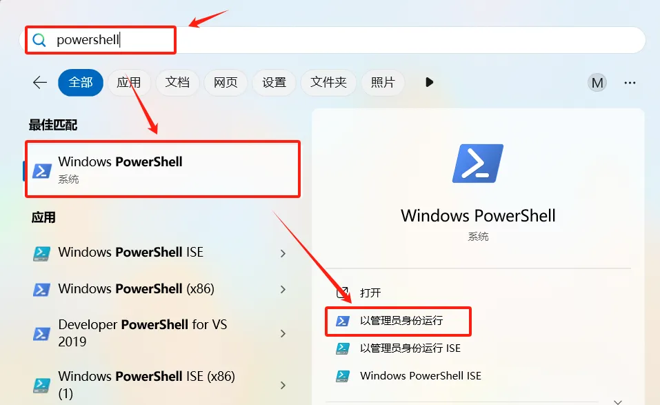 点击开始菜单 → 搜索「PowerShell」→ 右键点击 → 选择「以管理员身份运行」。后续所有步骤都在这个窗口里操作。
