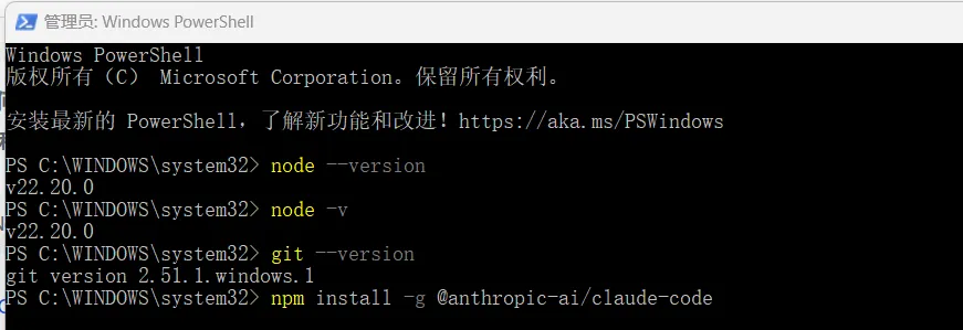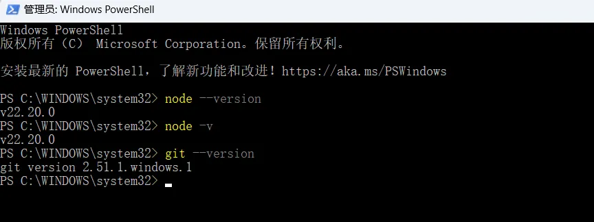 - 打开「终端」(Terminal)而非 PowerShell,验证安装 Node.js 和 Git 的命令相同