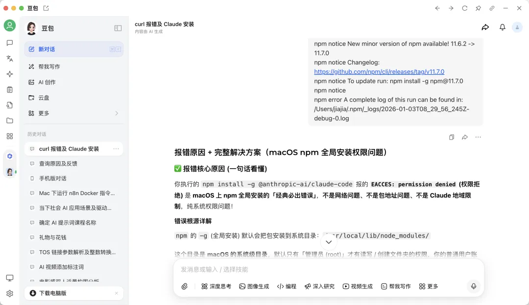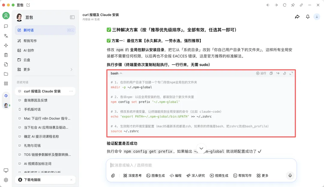 - 我把在终端中的内容全部复制给“豆包”后,给到了解决办法:
