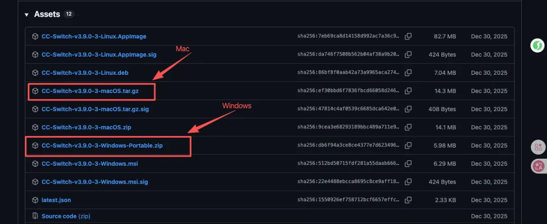 - 1.前往 CCSwitch 项目页面下载(Windows 选 Windows 版,Mac 选对应版本),网址:https://github.com/farion1231/cc-switch/releases/tag/v3.9.0-3