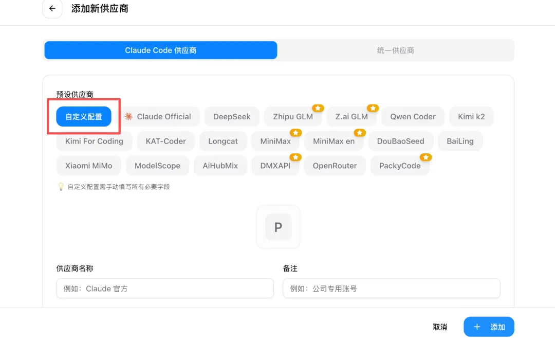 - 4.在获得API之后,在 CCSwitch 里点击右上角「添加模型」,进入选择「自定义配置」,在下面的表格中填入:供应商【火山豆包】,API Key【您自己刚才创建的 API Key】请求地址【https://ark.cn-beijing.volces.com/api/coding】,主模型【doubao-seed-2.0-code】,最后点「添加」。