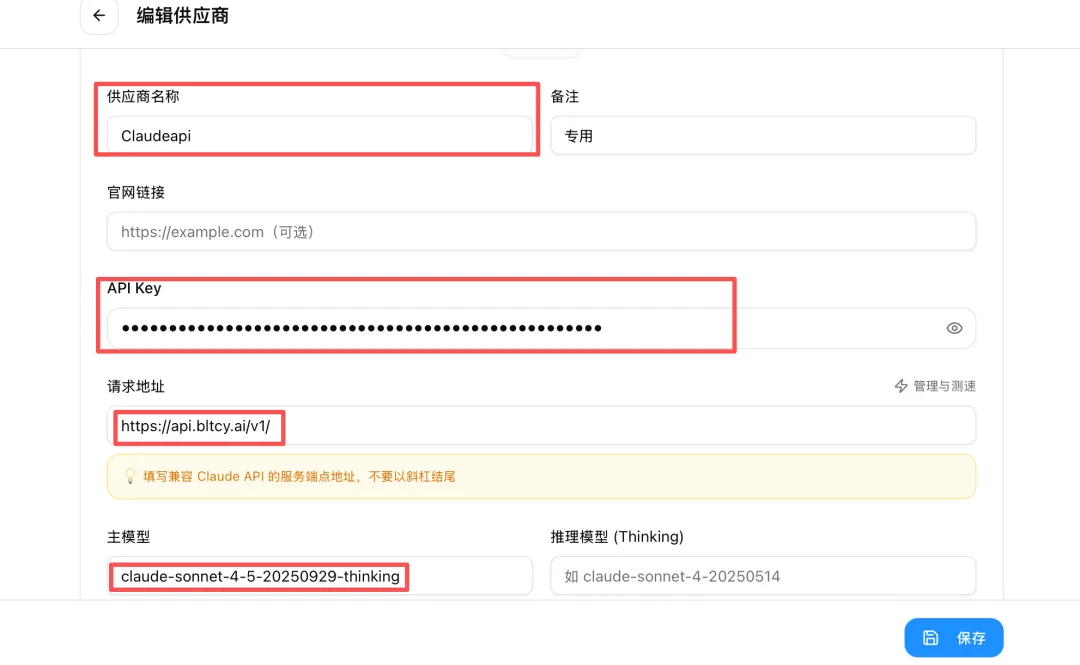 - 2.填写供应商名称(如:Claude APi),请求接口地址【https://api.kafeiai.cn】,你的令牌(在上面中转平台上创建的令牌进行复制粘贴即可),主模型【claude-sonnet-4-5-20250929-thinking】,保存