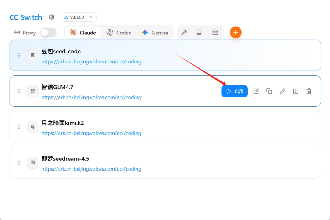 - 3.模型切换。现在默认使用的是火山豆包模型,如果要切换为其他模型也非常简单。如下图,点击启用