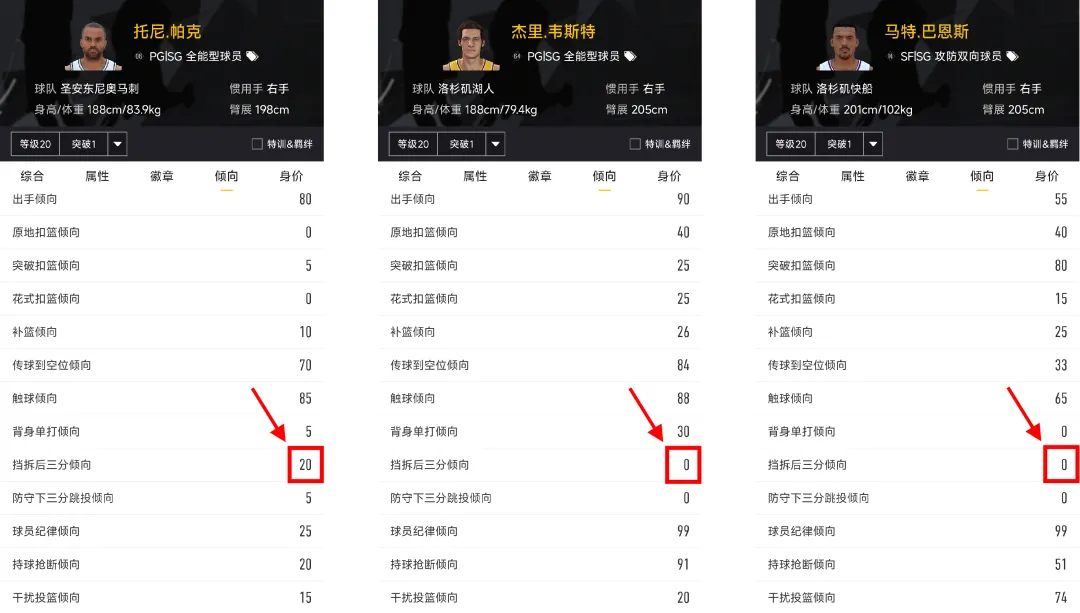 06版托尼帕克挡拆后三分倾向为20,意味着但凡2步之内有人他就不会投三分,只有大空位时才会比较犹豫地出手,所以帕克也不推荐当射手用,性价比较低,我的天梯里也没把他排进去。