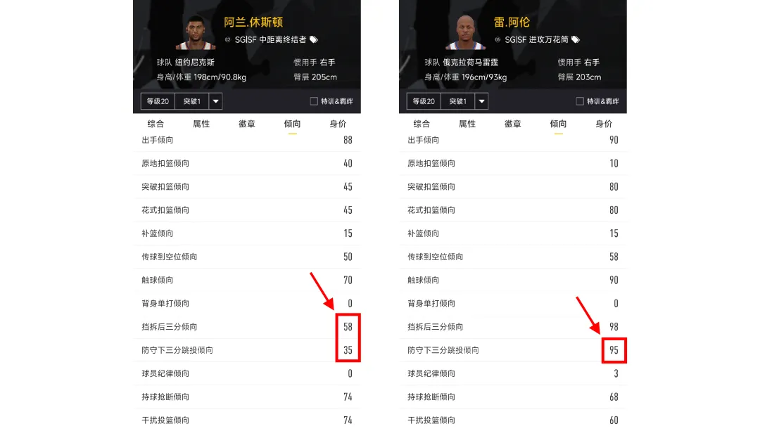 比如02版阿兰休斯顿,挡拆后三分倾向为58,战术型三分出了空位能果断出手;但防守下三分跳投倾向为35,偏低,在面前有防守球员时大概率不会顶投,也就显得比较理性。