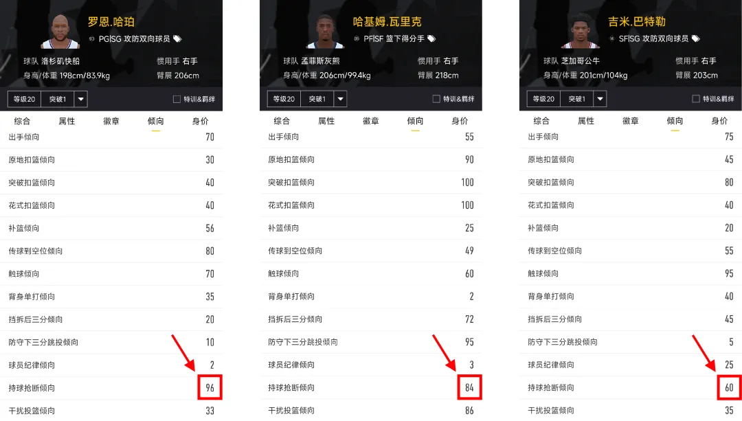 主要影响球员:发牌员、工具人。防守持球球员时,主动伸手抢断的倾向。这个倾向毫无疑问是越高越好,倾向很高的话,即便抢断数值不高、没有抢断徽章,也能有非常亮眼的表现,比如06版哈基姆瓦里克;相反,如果抢断倾向不高,即便数值和徽章拉满,抢断数量也不会很多,比如14版吉米巴特勒;当然倾向、数值、徽章都拉满的话抢断肯定很强,比如93罗恩哈珀。