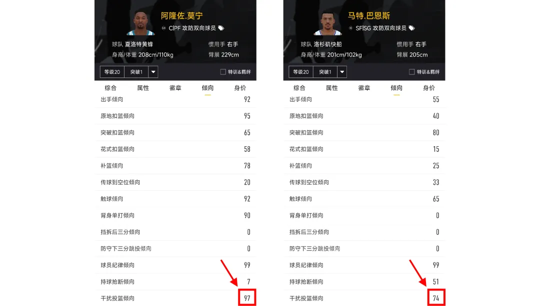 主要影响球员:全员。对方球员投篮时,举手干扰的倾向。这个倾向也是越高越好,倾向越高,就越喜欢举手干扰,内外线都是这样。不过这个只是举手干扰,我们在比赛中看到的大跳往前扑的那种干扰还受到“盖帽”倾向影响。
