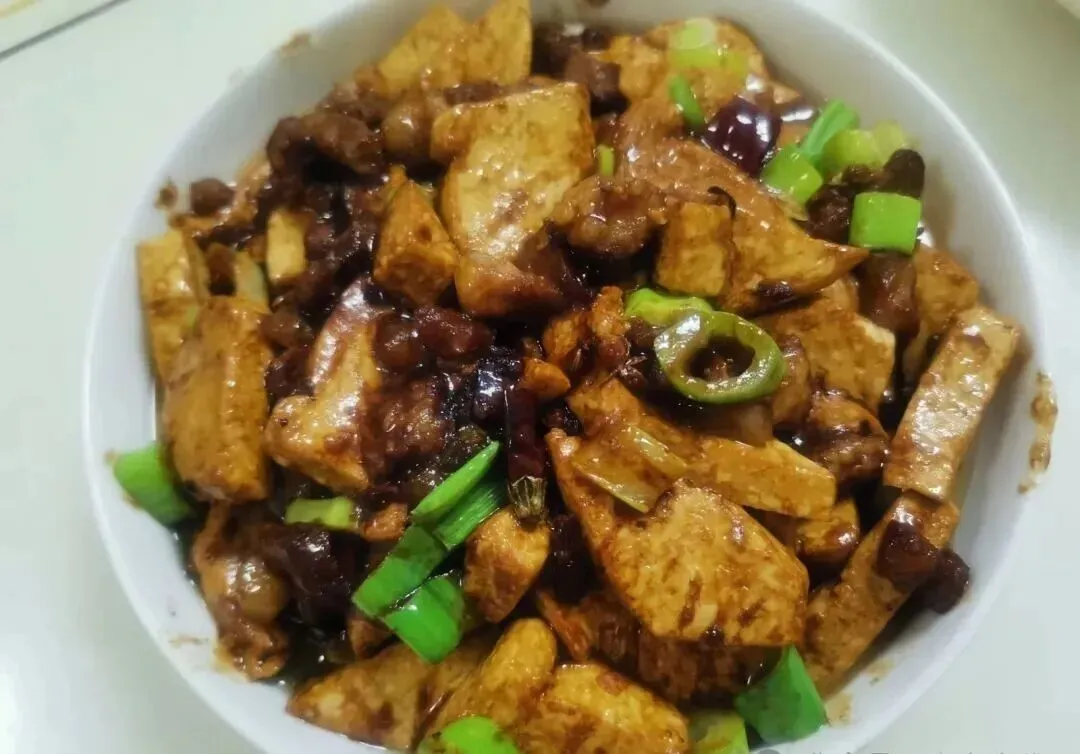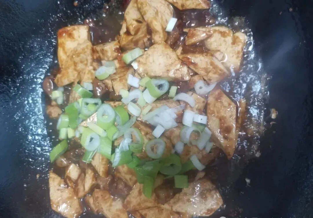 豆腐倒进去 , 翻炒 , 料汁淋上 , 煮到汤汁浓稠裹住每一块豆腐 , 出锅前撒把葱花 , 完美!