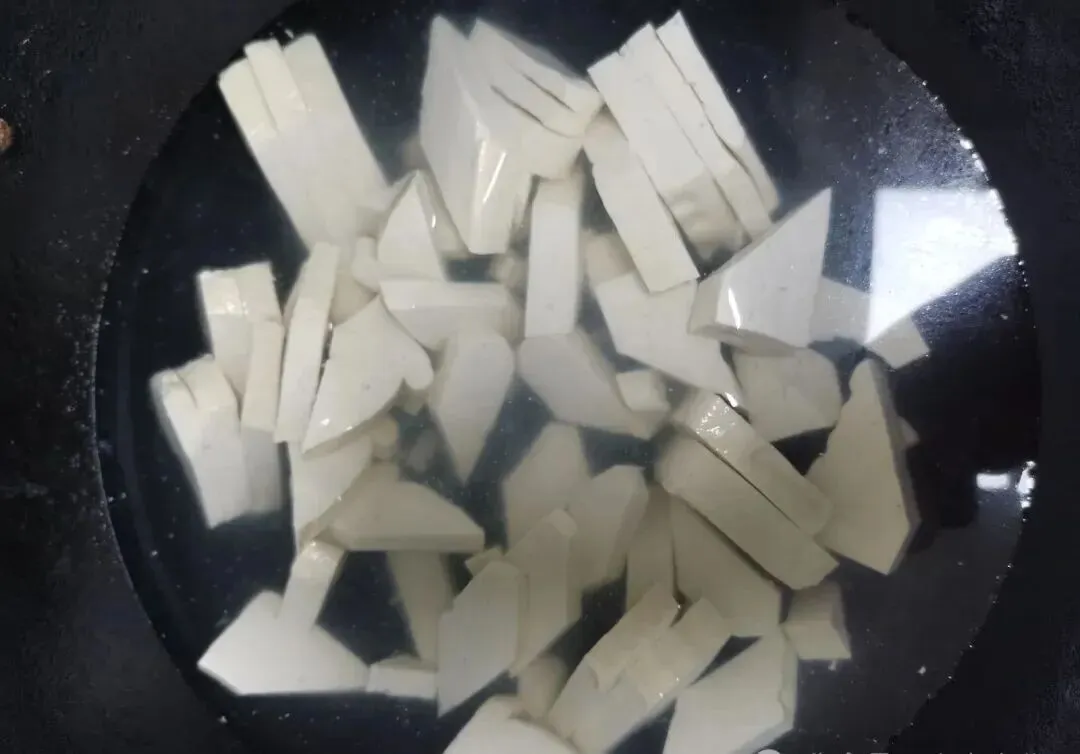 豆腐切块 , 凉水下锅 , 加一丢丢盐 , 水开了就捞 , 别省这步!焯过的豆腐不碎 , 口感嫩得不行 , 跳过这步你会后悔的…