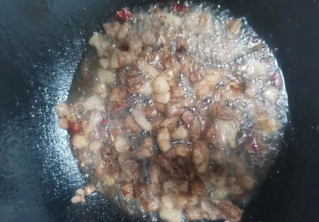 锅烧干 , 倒油 , 肉沫下锅炒变色 , 肥肉多就油少放点 , 不然腻!