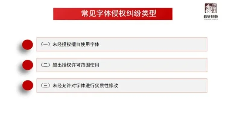 在日常商业活动中,字体侵权已成为企业高频触发的法律风险。许多当事人直到收到律师函,才恍然大悟:原来用“字”也可能侵权。以下五大常见的未经授权擅自使用字库字体的行为,请务必自查:
