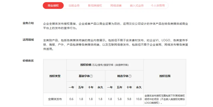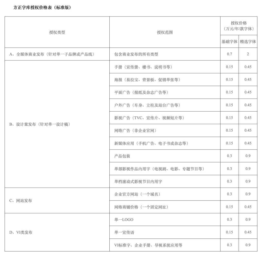 经查,截至2026年1月13日方正字库商业授权价格如下: