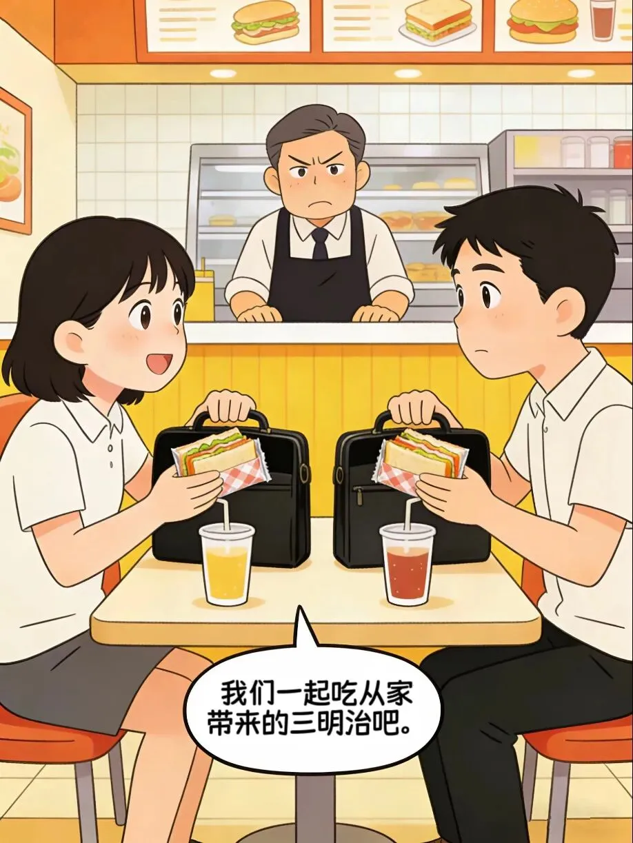 午休时间,两位学生走进了快餐店,各自点了一杯饮料,却从包里掏出了家里做的三明治。
