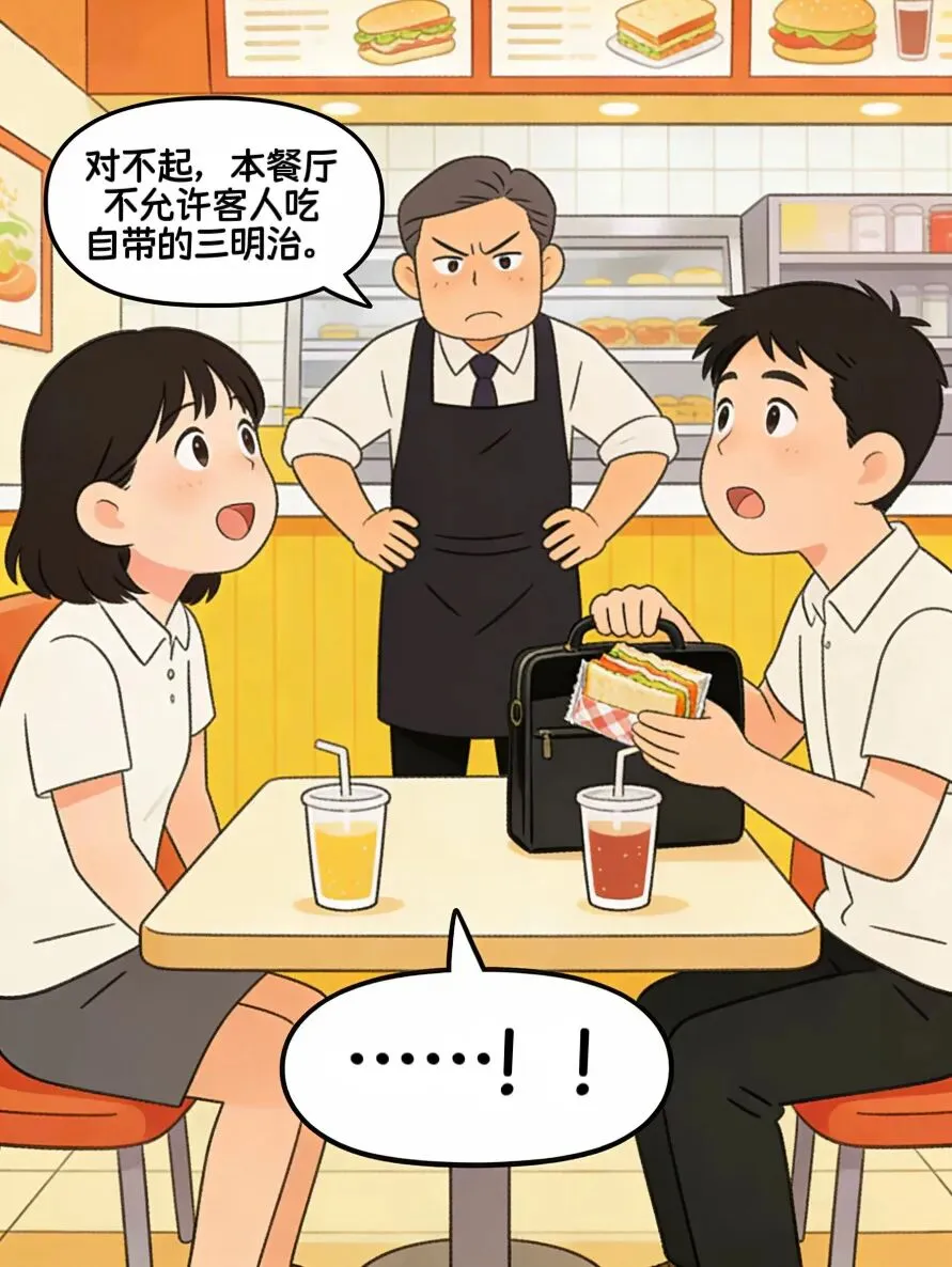 两人刚要开动,板着脸的店长就叉着腰走了过来,严肃地提醒:“对不起,本餐厅不允许客人吃自带的三明治。”
