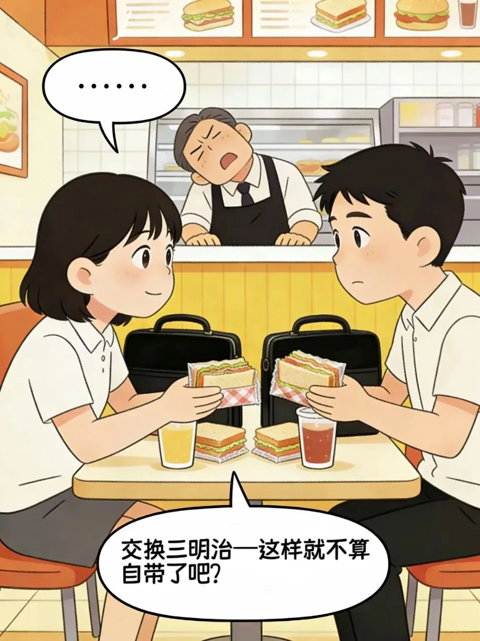 店长看着桌上两份被交换过的三明治,瞬间扶额叹气,彻底败给了这两个机灵鬼。