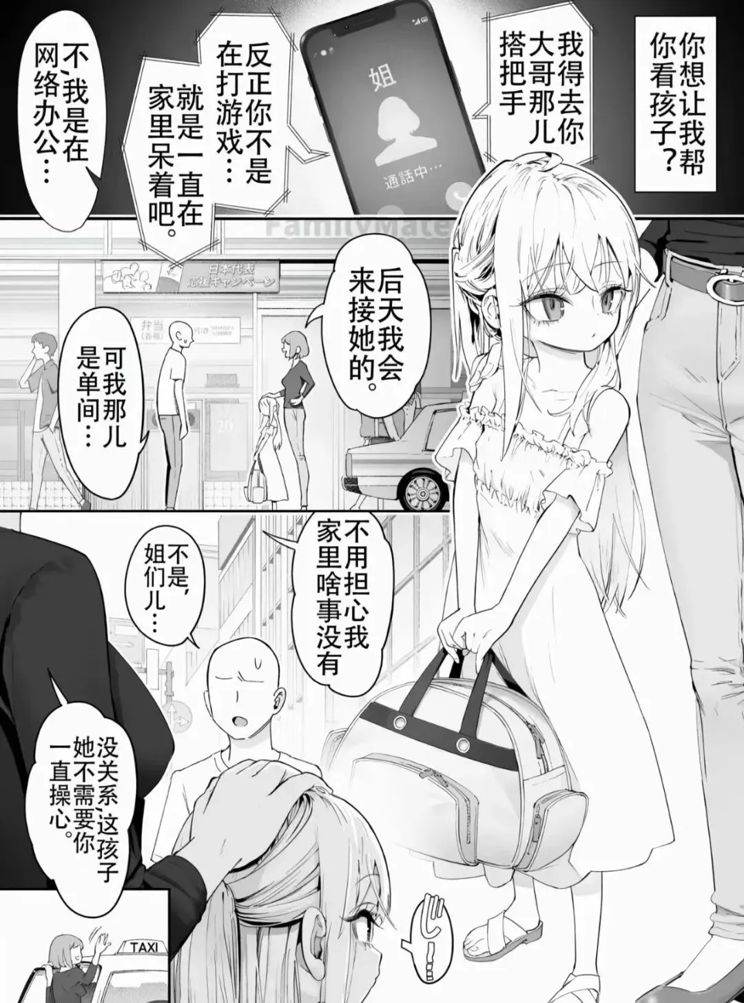 女孩的姐姐打来电话,语气带着歉意:“你想让我帮你看孩子?”电话那头的声音含糊:“不、我不是在网络办公…… 反正你不是在打游戏…… 就一直在家里呆着吧。”姐姐无奈应允:“后天我会来接她的。”女孩站在街头,身旁是一位光头男性(舅舅),她提着行李,有些不安:“可我那儿是单间……”舅舅温柔地摸了摸她的头:“不用担心,我家里啥事没有。这孩子不需要你一直操心。”远处,一辆出租车驶来,女孩的姐姐正挥手示意。