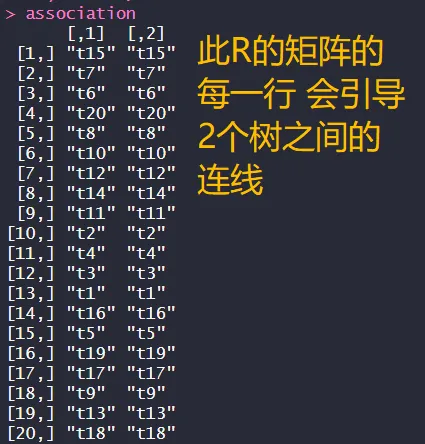 用于绘制链接的关联矩阵必须是包含尖端/Tips名称的两列矩阵。矩阵中的1行表示绘图上的1个连接线。矩阵的第1列必须包含第1棵树(phy1)的顶端/Tip标签,矩阵的第2列必须包含第2棵树(phy2)的顶端/Tip标签。矩阵中的行数没有限制。一个有2列、1行的矩阵,将给出只有1个连接线的图。