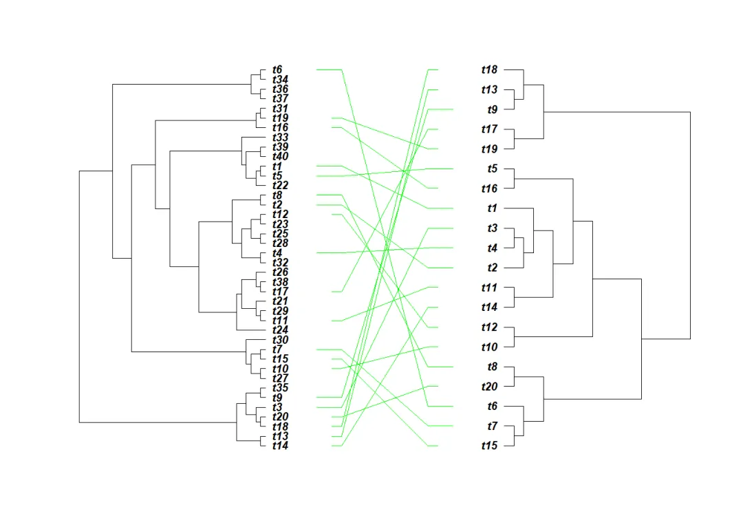 # 面对面树library(ape)# cophyloplot函数:绘制两个系统发育树的面对面(Face to face)图,并在顶端(Tips,即序列名)之间连线。用于比较、展示2个有所关联的系统发育树。# 如果指定了链接(Links,即2列Tips名称)方式,此函数将绘制两棵面对面的树。通过鼠标单击可围绕节点 (Nodes)旋转每棵树的分支 (Branches)。#two random treestree1 <- rtree(40)tree2 <- rtree(20)tree1# Phylogenetic tree with 40 tips and 39 internal nodes.# Tip labels:# t14, t13, t18, t20, t3, t9, ...# Rooted; includes branch lengths.tree2# Phylogenetic tree with 20 tips and 19 internal nodes.# Tip labels:# t15, t7, t6, t20, t8, t10, ...# Rooted; includes branch lengths.# 生成1个关联矩阵,来引导2棵树之间的连线:association <- cbind(tree2$tip.label, tree2$tip.label)association