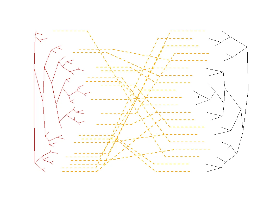 cophyloplot(tree1, tree2, assoc = association, type="cladogram", use.edge.length=T, space = 6, length.line = 1, gap = 2, rotate=F, col="orange", show.tip.label=F, font=4, lwd=2, lty=2)