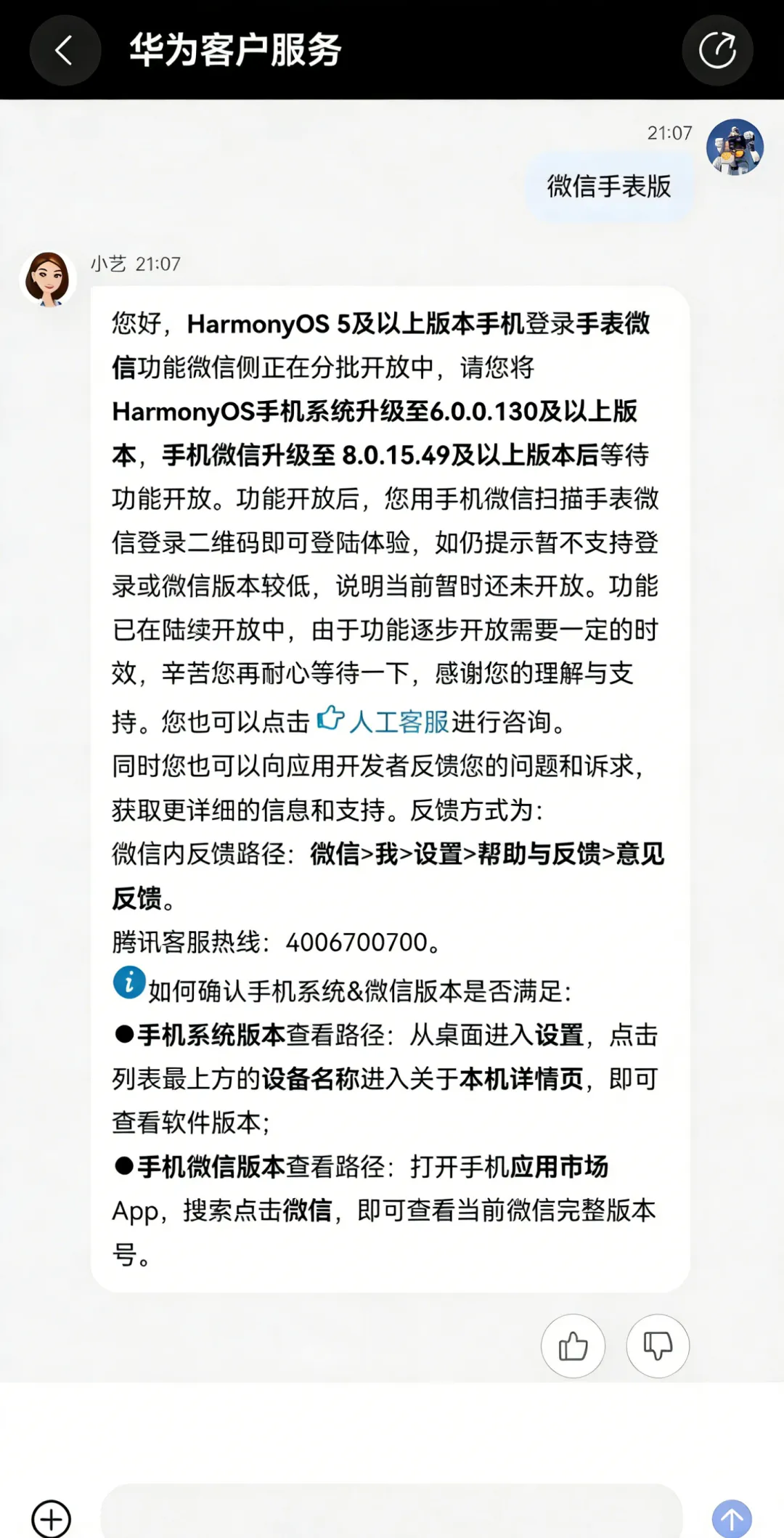 客服同时表示,HarmonyOS 5 及以上版本手机登录手表微信的功能,微信侧正在分批开放。满足上述两个条件后,耐心等待功能开放即可。
