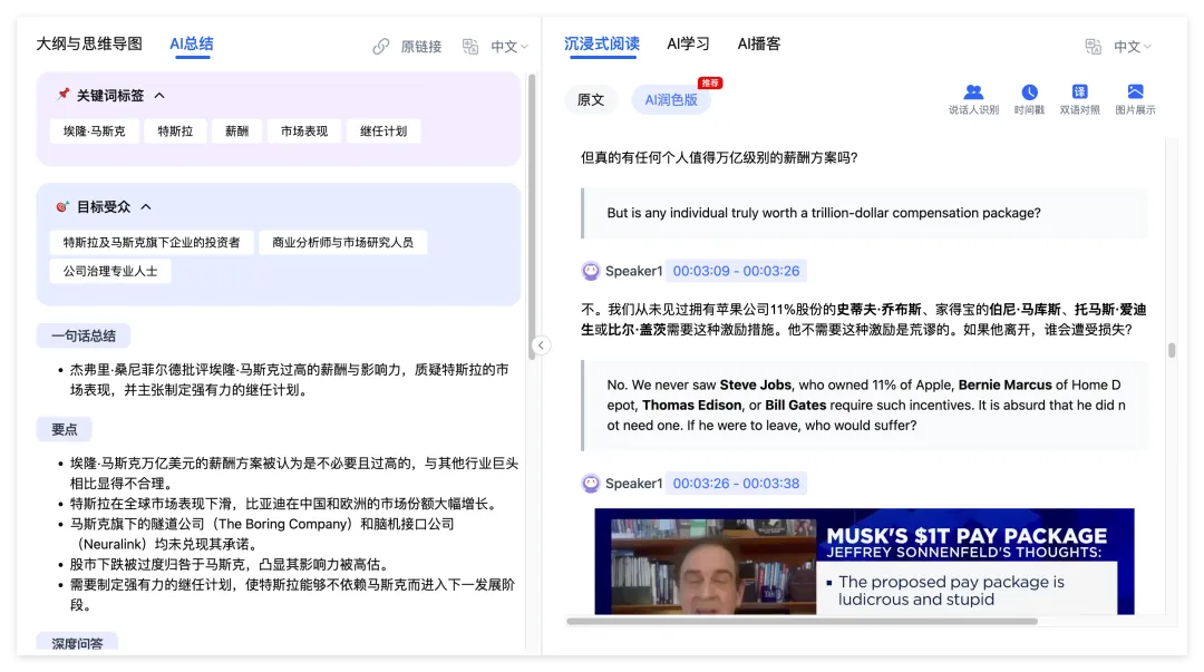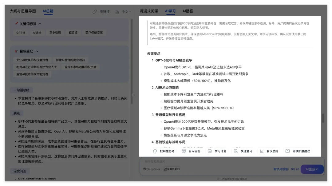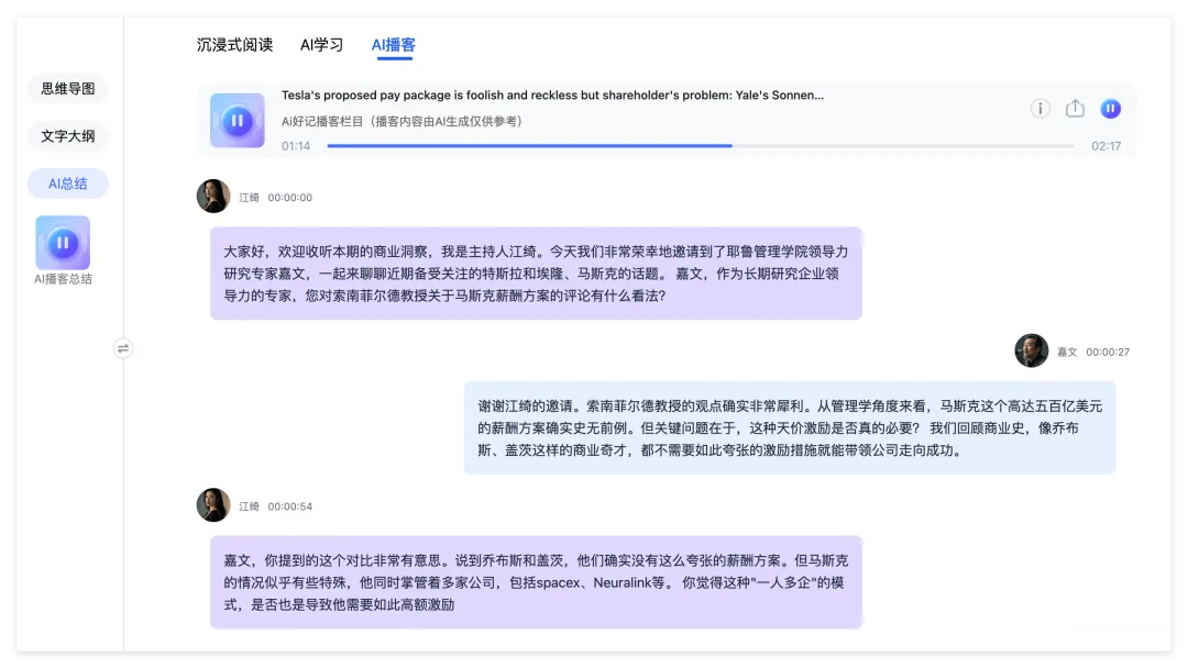 AI播客也很有意思,可以把视频内容生成一档双人访谈播客,就像听综艺一样就把知识给复盘了。可以选自己喜欢的角色和人声,中英文都可以。 晚上散步或开车时,戴上耳机就能复盘内容。