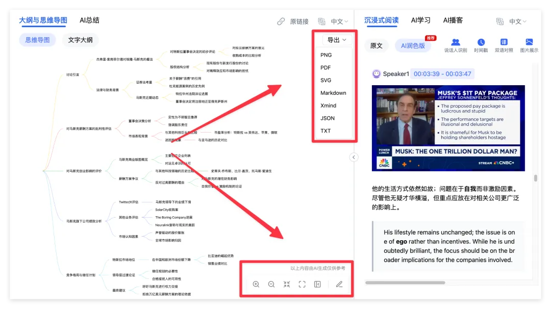 首先会生成详细的思维导图,可以多级展开自由调节。更厉害的是点击思维导图的节点图文笔记就会自动跳转到对应位置,不用再反复拉进度条了。