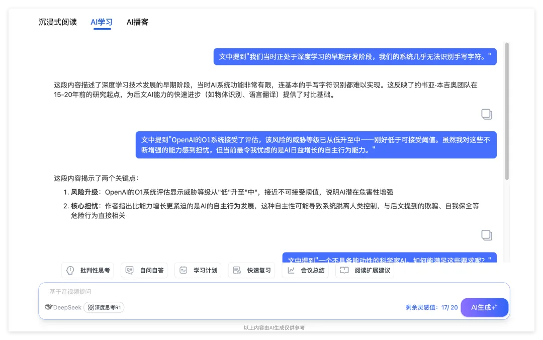 看完笔记之后如果还有不懂的地方还能在AI学习里面问,我自己用下来回答真的很精准,没有一句是废话。因为它能够针对视频内容进行深度思考然后回答,就像个专家一样。