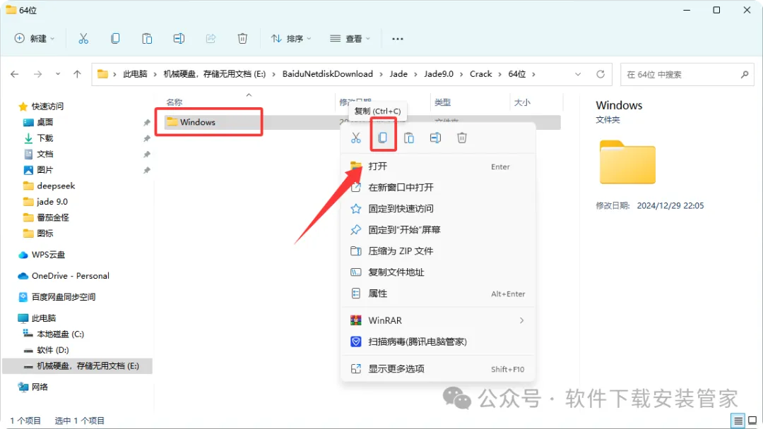 3.鼠标右键【Windows】文件夹,选择【复制】