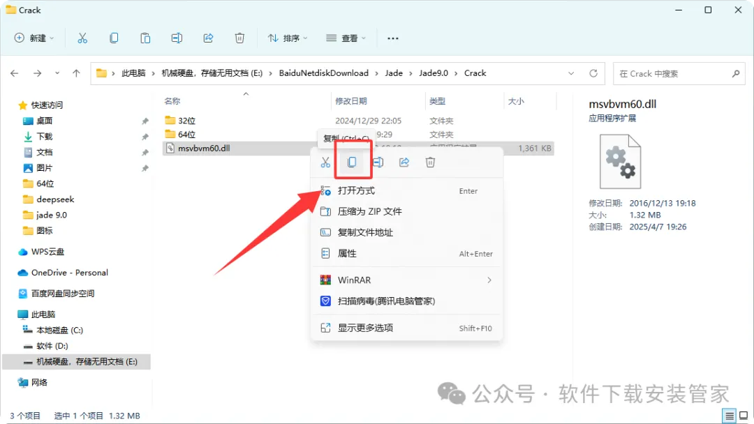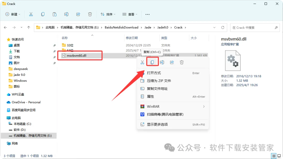 5.继续回到【Jade9.0】文件夹下的【Crack】文件夹,鼠标右键【msvbvm60.dll】选择【复制】