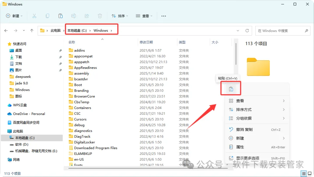 6.打开电脑C盘【Windows】文件夹,在空白处鼠标右键选择【粘贴】