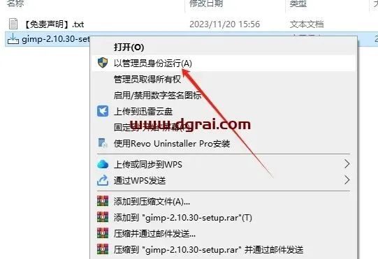 2、选择安装程序【gimp-2.10.30-setup.exe】鼠标右键以管理员身份运行