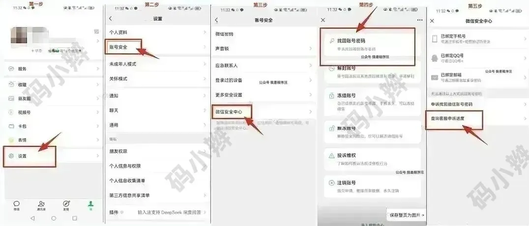 还可以在微信中依次点击「我」→「设置」→「账号安全」→「微信安全中心」,选择「找回账号密码」功能,输入手机号码和回执编号即可了解当前状态。