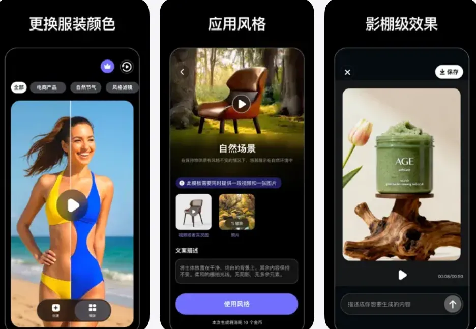 AI提示词编辑+参考图支持,背景移除/替换/生成(专攻白色背景制作),电商专属视频模板(模特试穿、产品演示、Listing 视频)