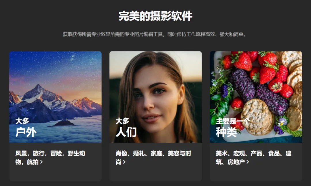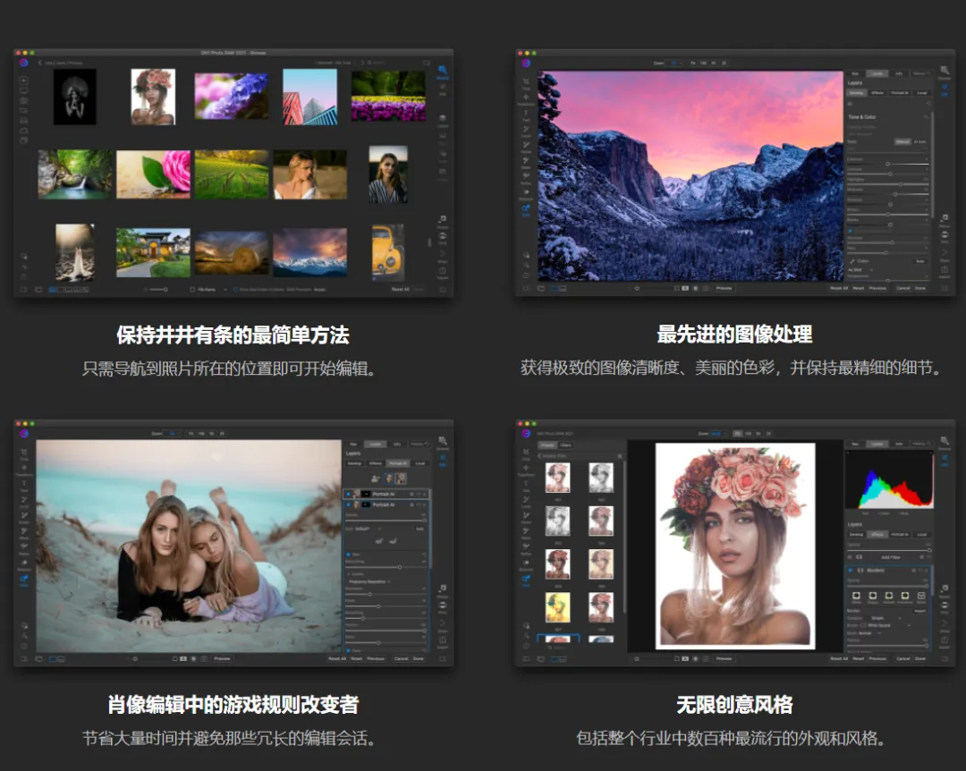 包含数百种快速,无损,可重新编辑和可自定义的照片效果和滤镜,可提供无限的创意可能性。你可以使用强大的遮罩工具,本地调整,混合选项以及应用来完全控制如何应用每种照片效果。